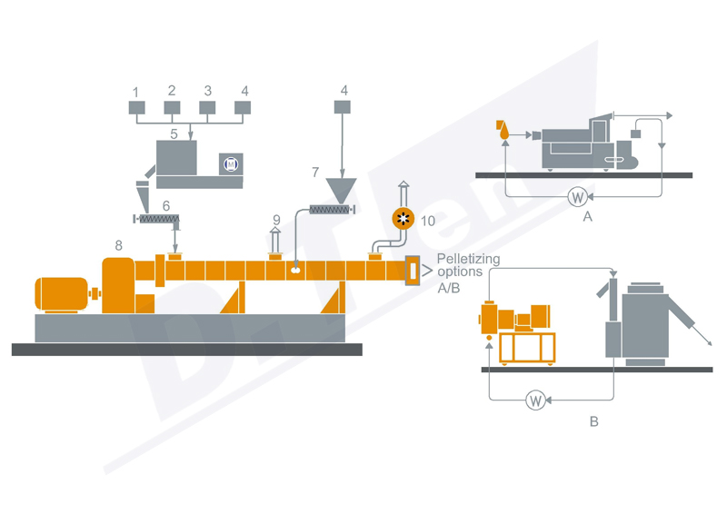 1. 聚合物 2. 彈性體(SBS、SEBS、EPDM等) 3. 軟化劑(油) 4. 填充 5. 高速混合機(jī) 6. 體積式喂料機(jī) 7. 側(cè)向喂料機(jī)(可選) 8. 雙螺桿擠出機(jī) 9. 自然排氣 10. 強(qiáng)制真空排氣 切粒方式: A. 水環(huán)模面切粒 B. 水下切粒 |